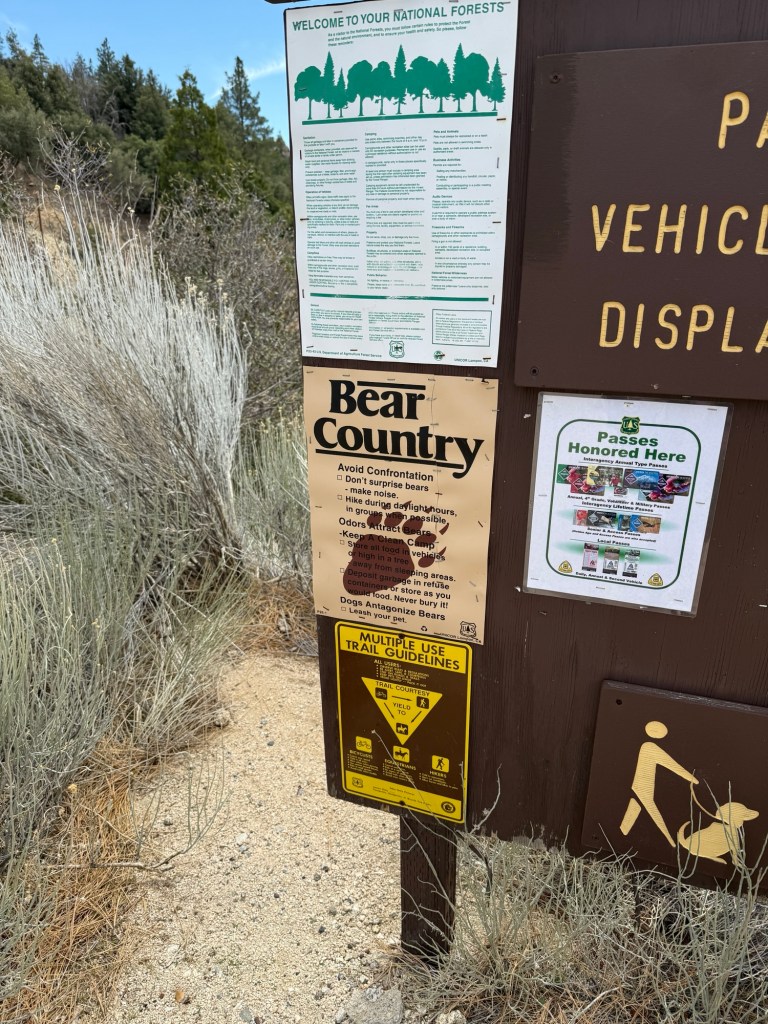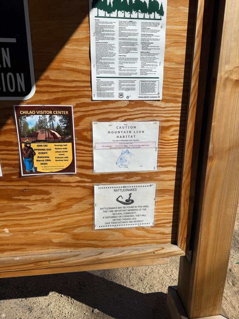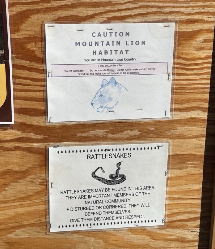 After I walk to the end of the campground I read the bulletin board that gives me the heads up about the local wildlife. Of course mountain lions and rattlesnakes. I’d like to see one but not the other. From a far far distance.
