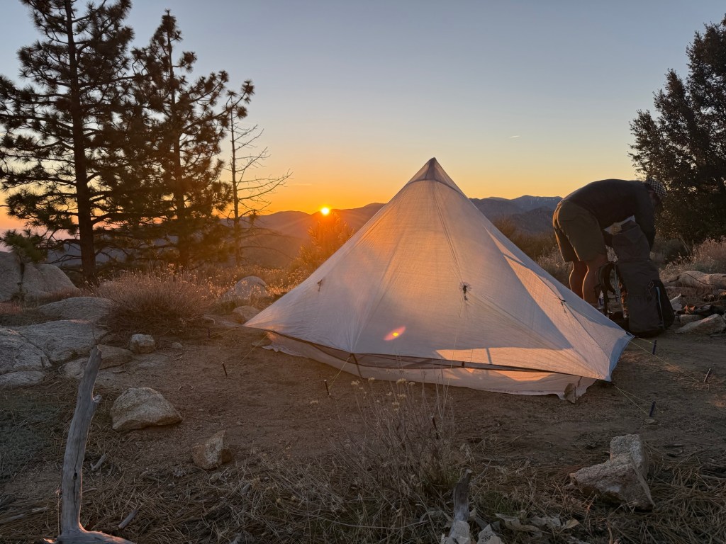 I grab a spot to pitch my tent next to some Joshua trees for cover from the wind and then grab 4 liters of water. I’ll drink 2 liters tonight and probably grab 2 more tomorrow for the road before I leave.