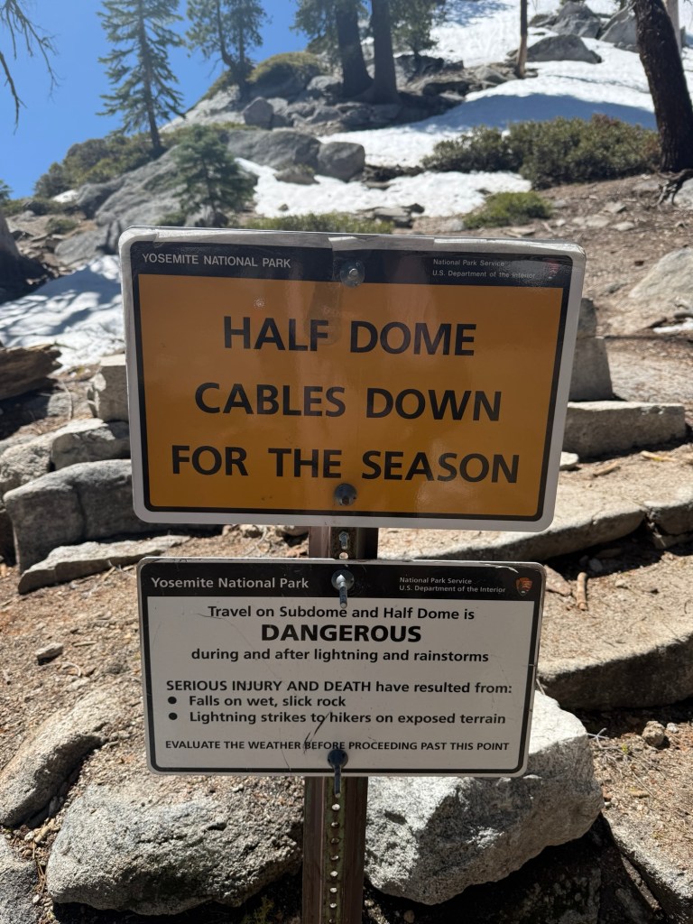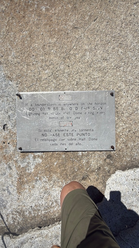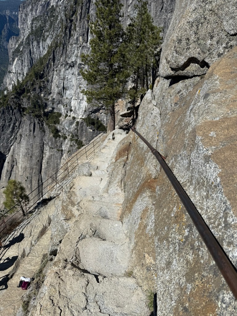 We get to the first falls Vernal falls, pretty cool, then to the second falls. Even cooler, there’s a few places were we could’ve filtered water if we needed it. As thru hikers were keen to “find water.” We keep going past the last bathroom and say ok now let’s get to half dome. Another mile and we see a small ranger station and start to climb. I get to the point of “stairs” and say wtf. This is another mile of 1500’ climb. Let’s go what a slog.