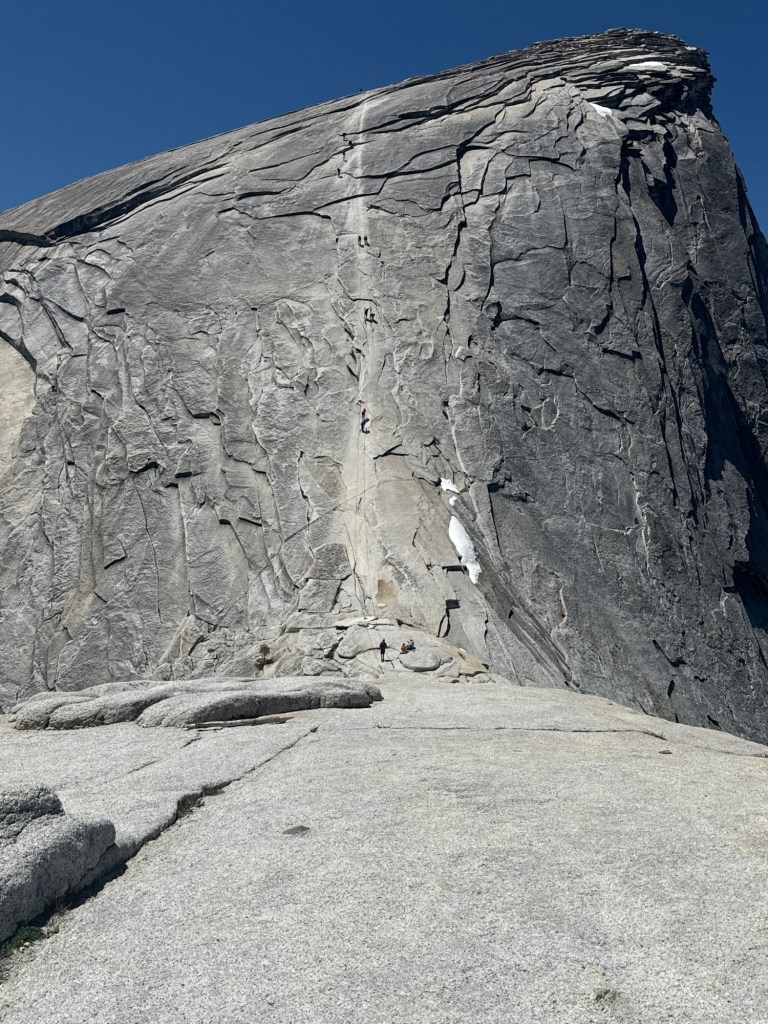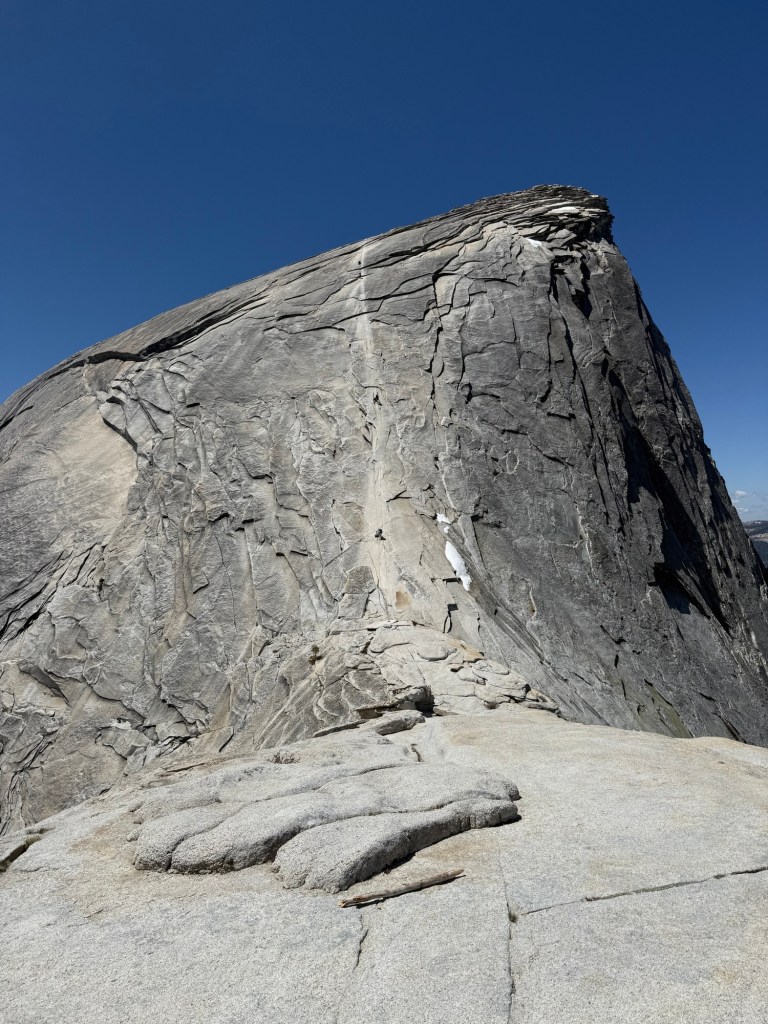 We get above the stairs and the rocks are just slick, wet and straight up onto the sub dome. Then finally we get to the bottom of half dome. And wow, what an awesome hike up and climb. Pretty sketch but we got it done. We turn to leave and start the decent back beneath the tree line.