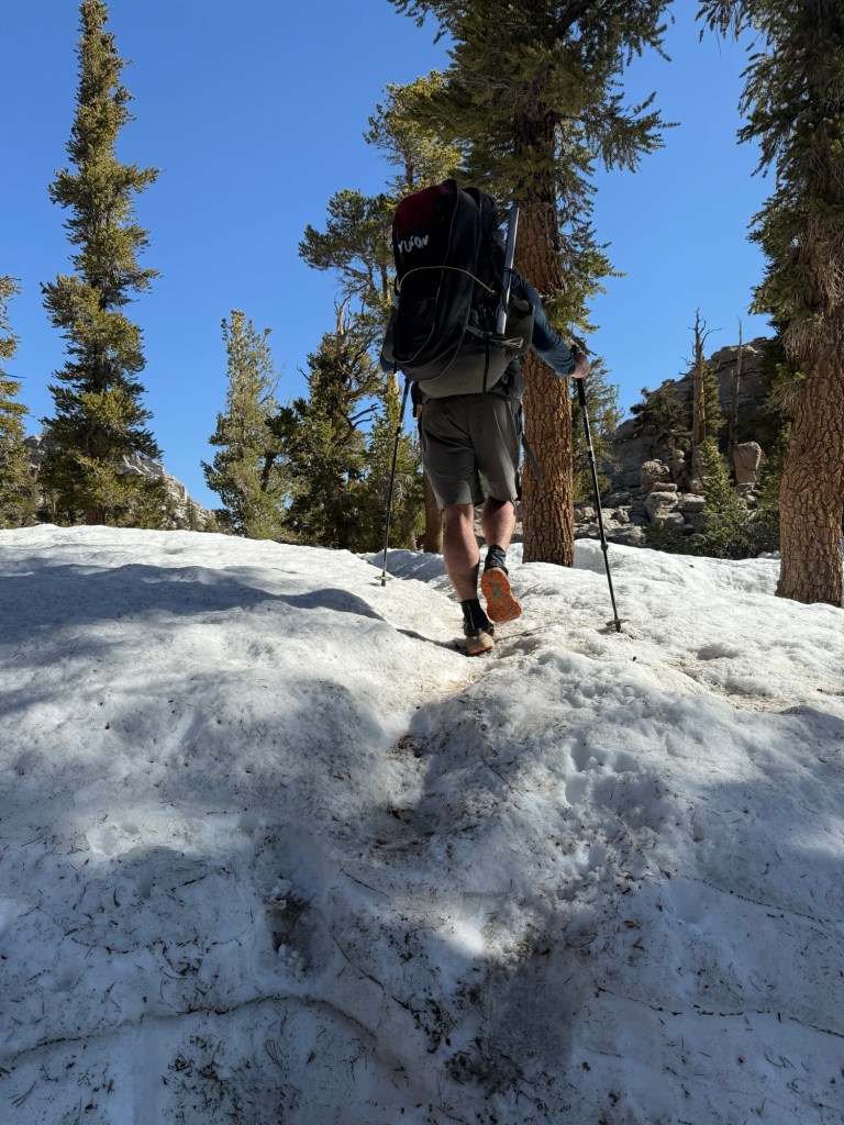 The views start the change and snow starts to appear. As soon as we hit 10,000’ elevation its patches of snow. Luckily is firm and we can just walk right over it, we go another three miles and stop for lunch. We’re going to yard sale our gear and dry it out from the night prior.