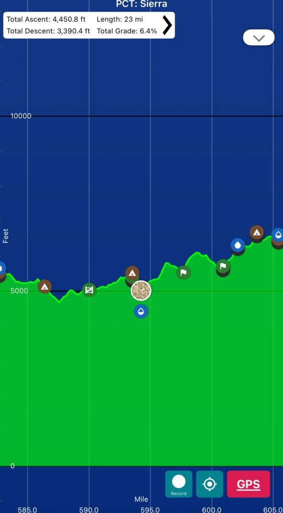 With that advice in mind I’m moving faster than I was before. Now also sweating a lot more I drank a ton of electrolytes last night. Need to avoid any chafing today. It’s like a blister, stop and address it immediately. Another mile and I’m in a groove on the downhill. I known this won’t last as there’s 2 big climbs before I get to my next camp.