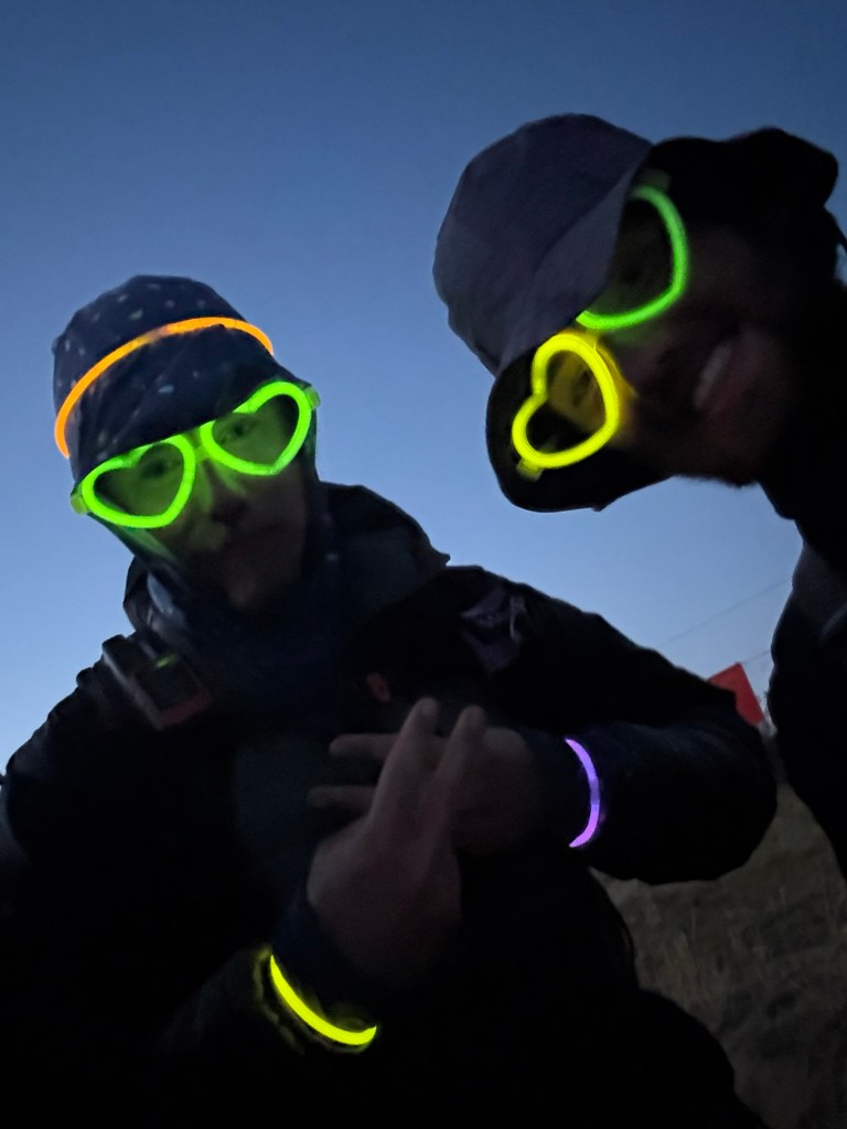 I pull out some surprises for the boys. Glow sticks and glasses so no one gets “lost” in the dark. It should also add to the evenings events through the wind farms. I look over at Seven and Tardy and just start dying laughing.