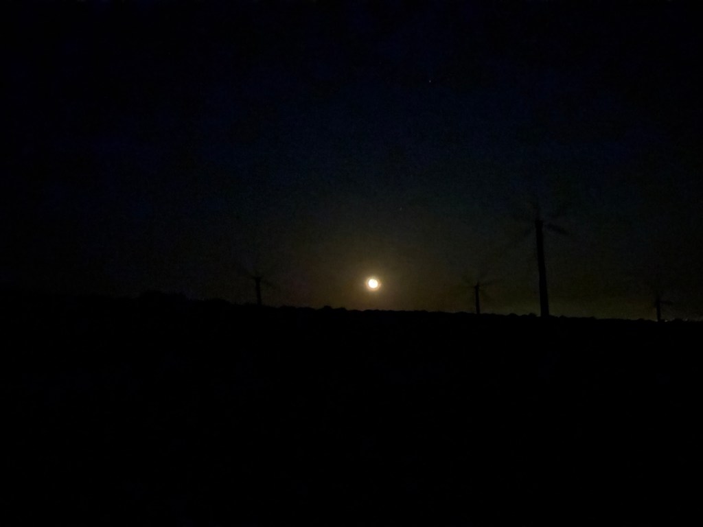 As we hit mile 18 it’s pure uphill through the wind farm, I can’t see them spinning but I can hear the whooshing as each huge blade swings by. In the distance maybe 900 yards I see a faint headlamp ahead of us. Hmm who’s that? Could it be Renaissance or someone we don’t know?