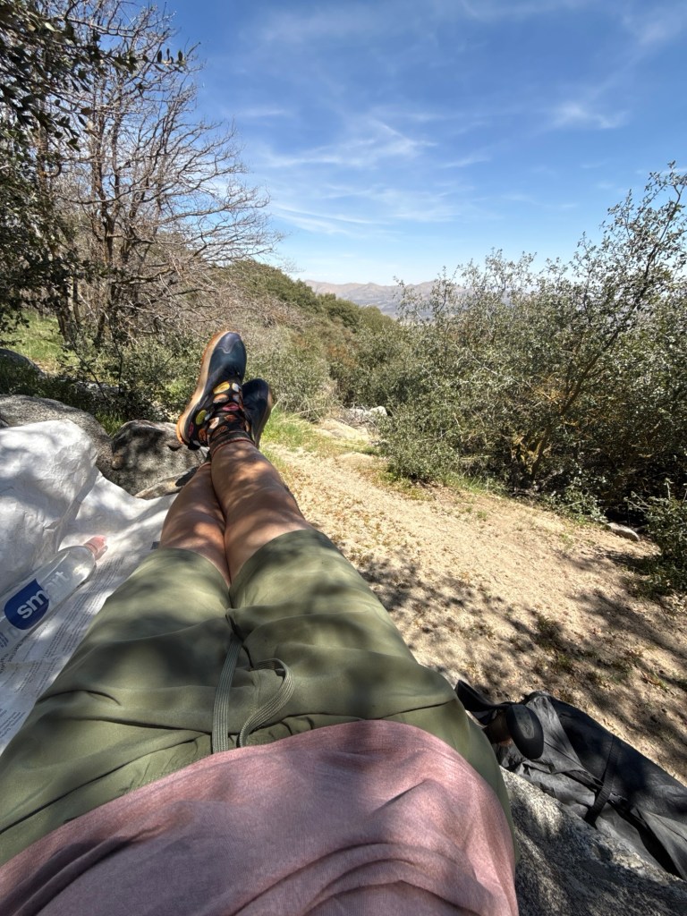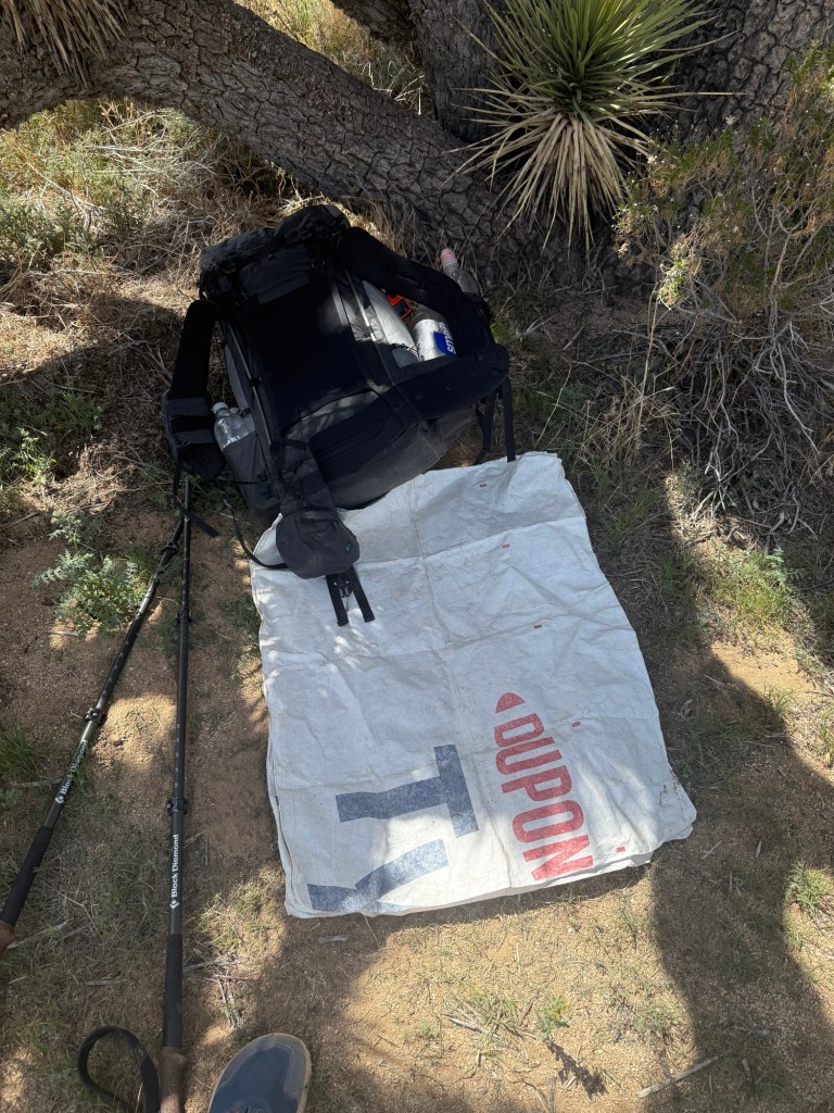 I reach the bottom and see a Joshua tree, that’s my chance for shade. I pop out my tyvek and lay it flat. Soak in the breaks when you can she said. Here’s my seat for the next 45 minutes. Mandatory break, UV index through the roof and sunblock doesn’t fight heat stroke.