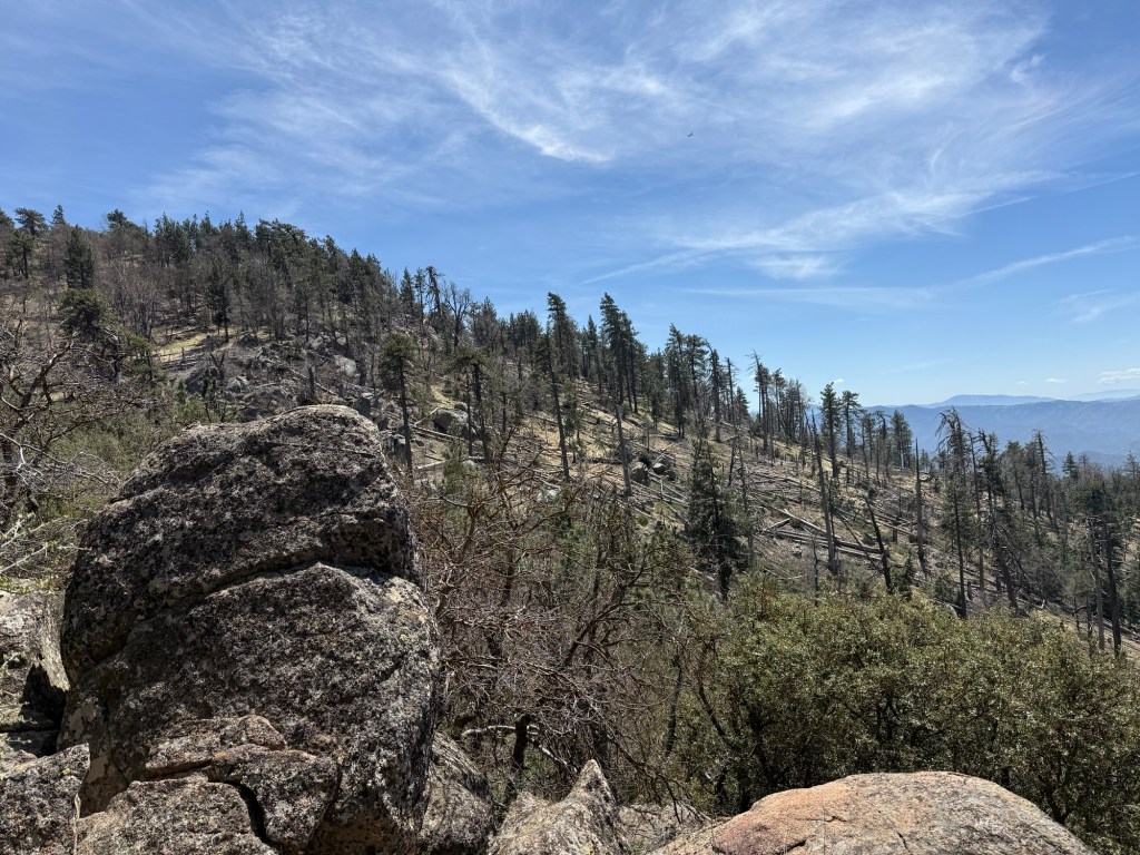I get to the trail Junction and decide to skip the cabin, I don’t need the water and it’s another .5 up a hill. I see Long Legs 50’ up the trail eating lunch and applying sunblock. Smart UV index is 10