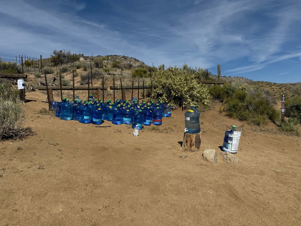 As I look over I can see where I’m going. I see the end goal for today. Let’s go. I take my headphone out and enjoy the last bit of silence of the trail. I walk down the last bit of trail into a large area that has parking for cars and a nice water cache set up. Without these 2 water caches this section probably wouldn’t be possible to hike. It’s brutally up, exposed and no water.