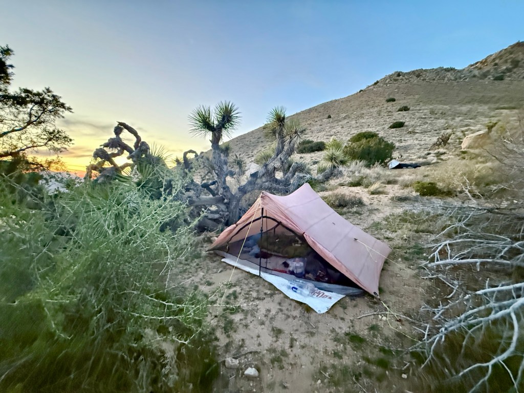 I grab a spot to pitch my tent next to some Joshua trees for cover from the wind and then grab 4 liters of water. I’ll drink 2 liters tonight and probably grab 2 more tomorrow for the road before I leave.