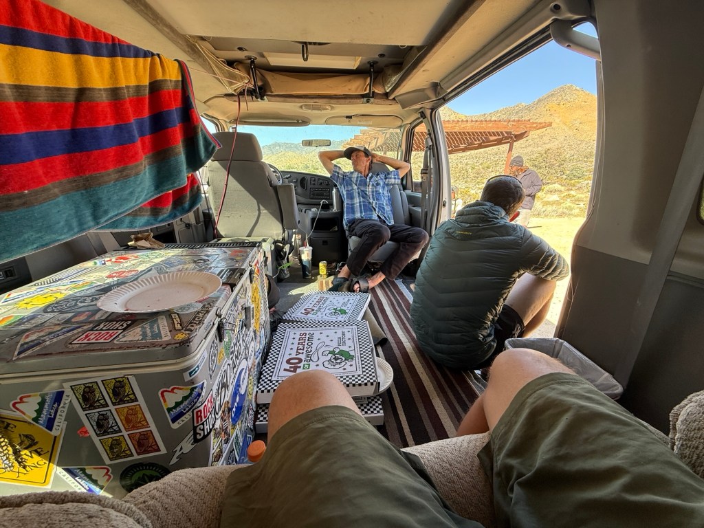 Stealthy shows up with 3XL pizzas, burgers, beers, Gatorade and cokes. What a guy. An hour later Coffee break shows up, 30 minutes after him Reaper and Stumbles. An hour later Seven walks into the campground completely sunburnt and walked right passed us. I had to yell his name. Zombie mode, headphones in. I toss him a beer and a slice of pizza. “sit down buddy you earned it.” I give him the recliner seat in the back of the van too.